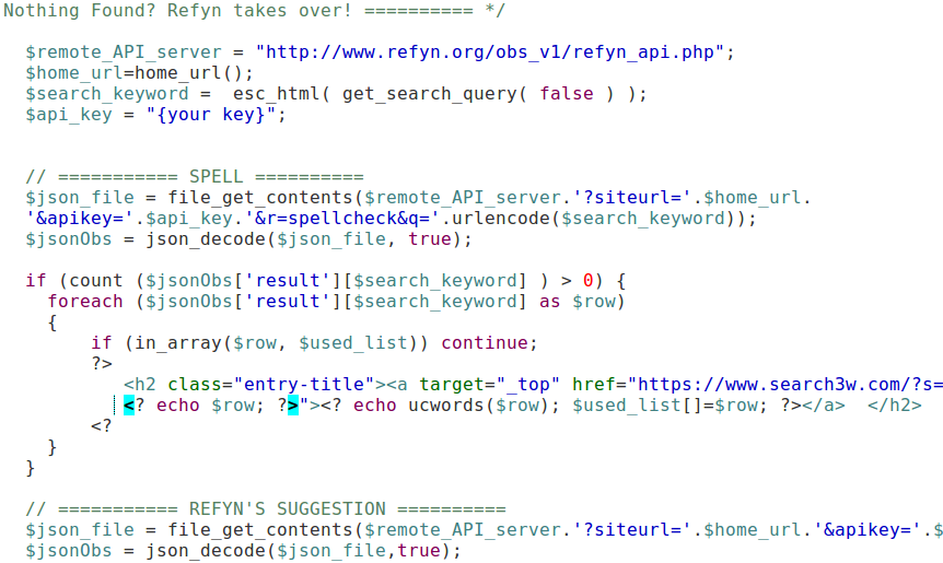 This option is using the Refyn search API without using the WordPress Refyn plugin. This works by customizing the search.php file which takes over /?s= with Refyn program as soon as its not found by the default WordPress search. When using Refyn this way you loose some features such as autocomplete.